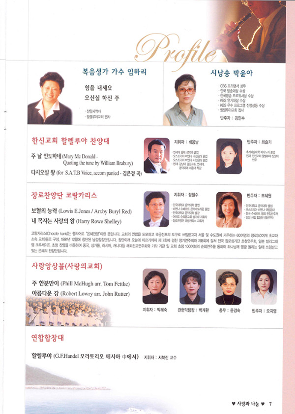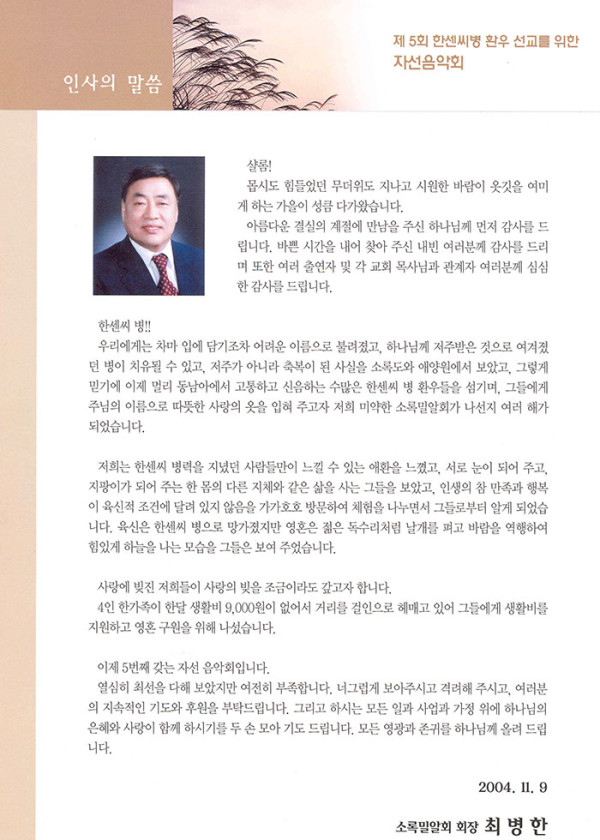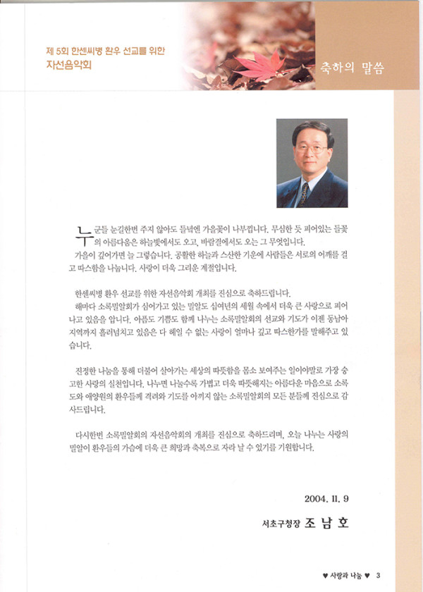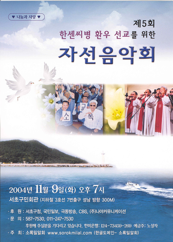 제05회 제5회 자선음악회 페이지 정보 목록 본문 일시 2004년 11월 9일 (화) 오후 7시 장소 서초구민회관 후원 서초구청, 국민일보, 극동방송, CBS, {주}나야커뮤니케이션 주최 소록밀알회(sorokmilal.com) 제5회 한센씨병 환우 선교를 위한 자선음악회주제: 나눔과 사랑 이전글제15회 자선음악회 14.11.19 다음글제6회 자선음악회 14.10.02
