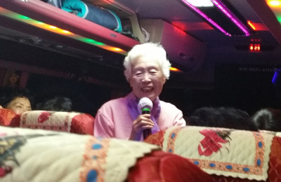 성지순례 방문자를 기다리는 버스 출발하기전 기도하시는 최종관 전회장님 (이 날 방문자가 너무 많아 최종관장로..