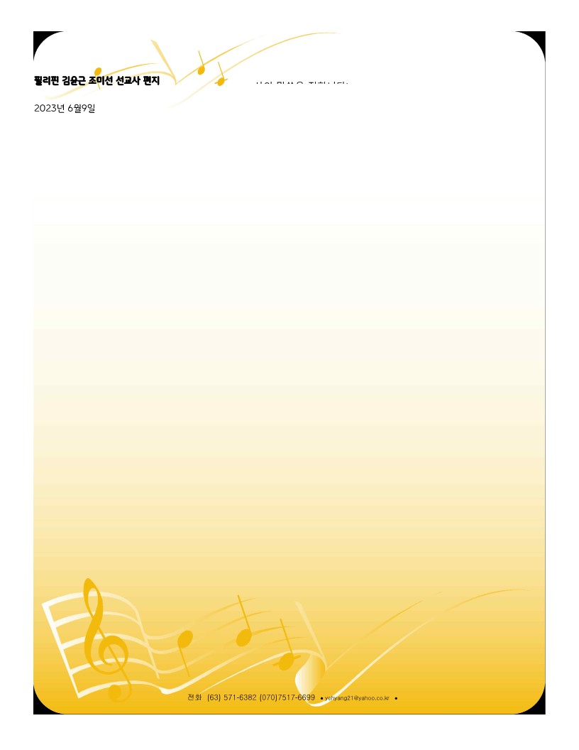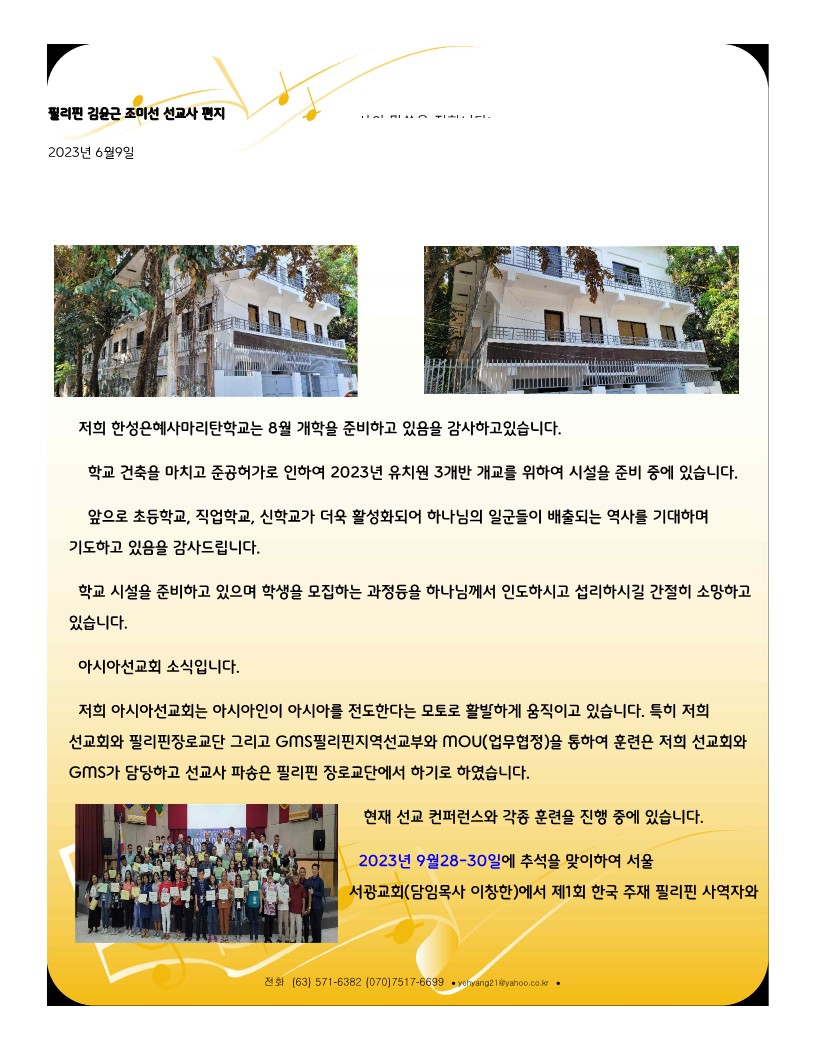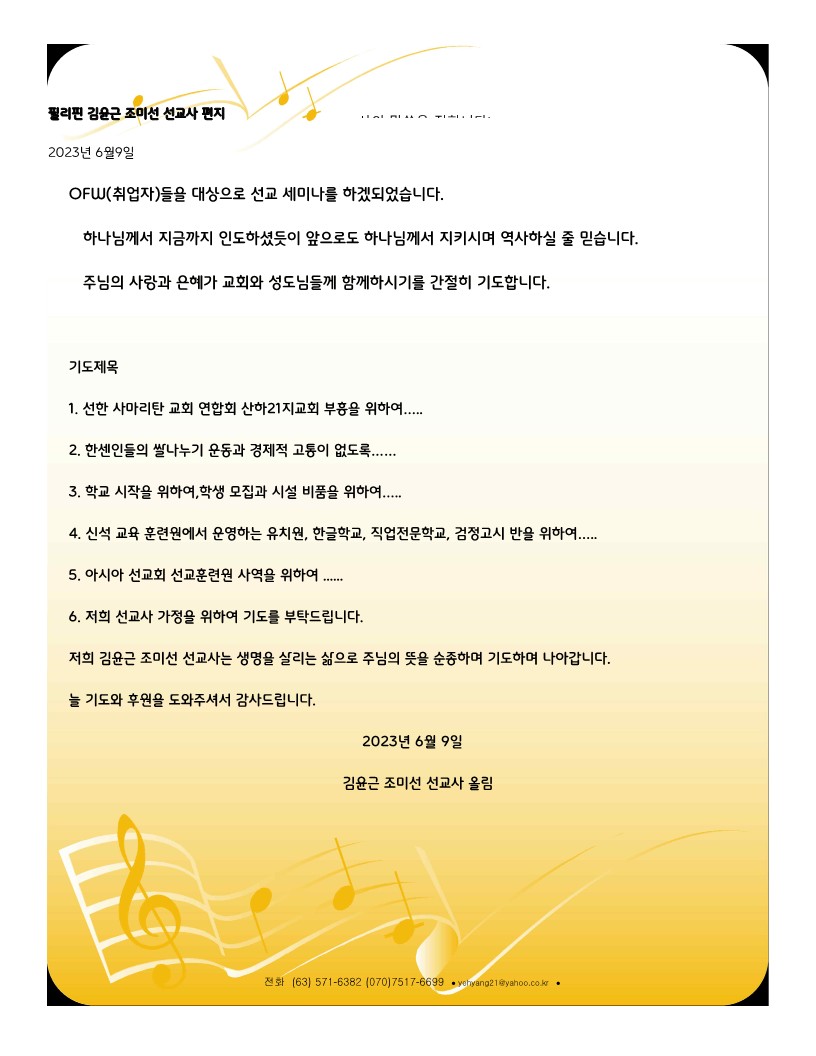 2023년 6월 선교보고 페이지 정보 작성자 소록밀알회 댓글 0건 조회 208회 작성일 23-07-12 16:53 목록 본문 2023년 6월 선교보고 이전글11월 선교편지 23.11.10 다음글2022년 5월 선교보고 22.05.10 댓글 0 댓글목록 등록된 댓글이 없습니다.
